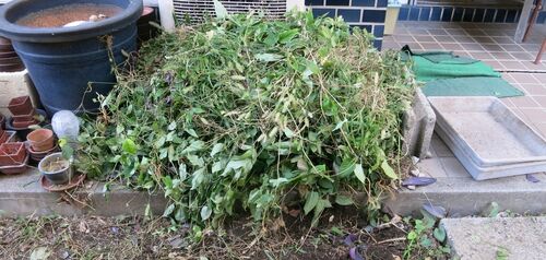 草山の場所を確保することから始まる。 玄関から門扉までの草をむしってから十日ほどが経った。積みあげた草山はすっかり枯れて、なだらかな丘ていどに圧縮されている。まずはこれを他処の枯草山に重ねて合体させた。 起床前の寝床で考えた。彼岸花周囲の草…